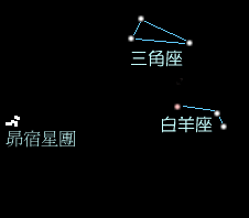 在仙女座南邊相接的小三角形就是三角座 . 星座雖然小 , 但其等腰三角形很容易找到 .
