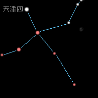 1 等星天津四(Deneb)是距我們1800光年的遙遠超巨星 . 以太陽的五千倍亮度在閃耀 . 看起來比夏季大三角的另外兩顆星牛郎和織女稍微暗淡一點 , 可是實際上是非常可怕地又大又亮 , 以絕對星等計算是-7.0等星(太陽只有4.8等) , 是全天最亮的 .