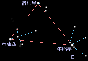 將七夕的牛郎星 , 織女星 , 以及在天鵝座尾巴閃爍的天津四這三顆1 等星連結起來的 , 就是夏季大三角 . 天鵝座是以長長的天鵝頸伸入大三角內的大十字表示的 . 相對南半球的南十字星 , 這個十字偶爾也叫做北十字星 . 可以說是個容易找到的星座 .