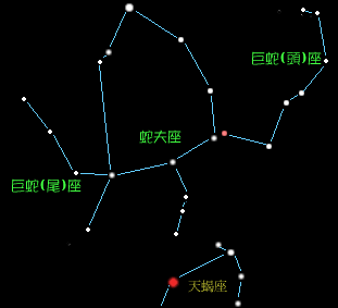 纏著蛇夫座的巨蛇座是頭尾分開的 , 不在一起的一個罕有星座 . 觀察時最好把頭尾看成一體 .